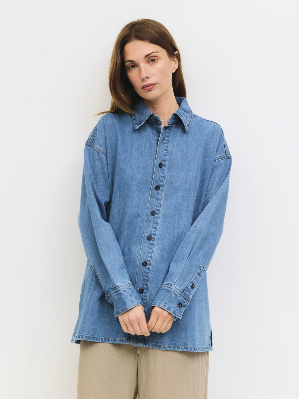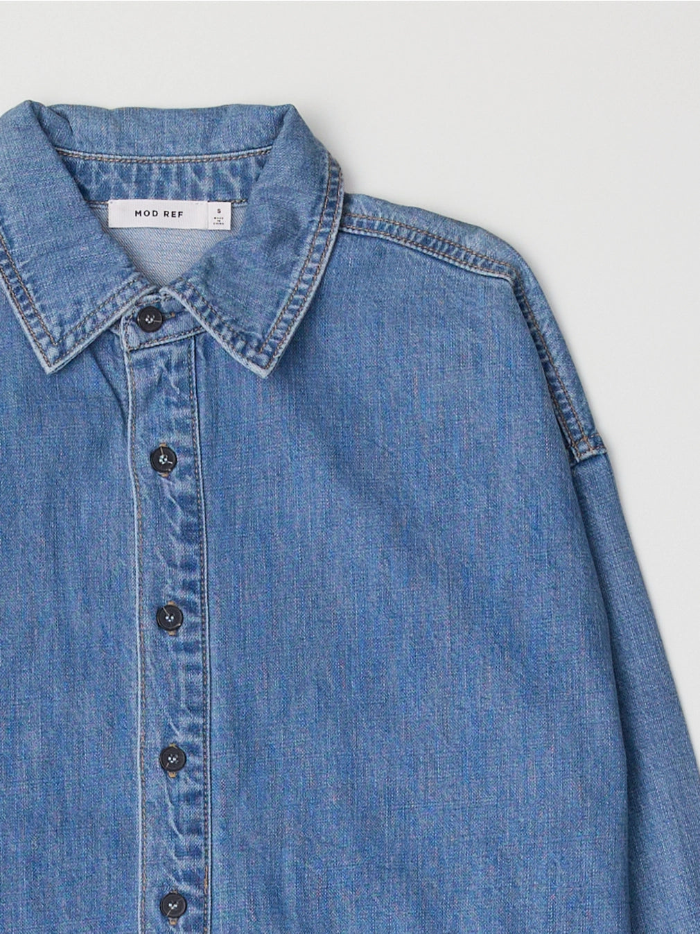 The Artie Top is our take on the classic denim shacket. Featuring an oversized fit, back yolk detail and contrast buttons, this piece is crafted from a soft, durable cotton fabric. Your new favorite go-to piece for a casual day out.