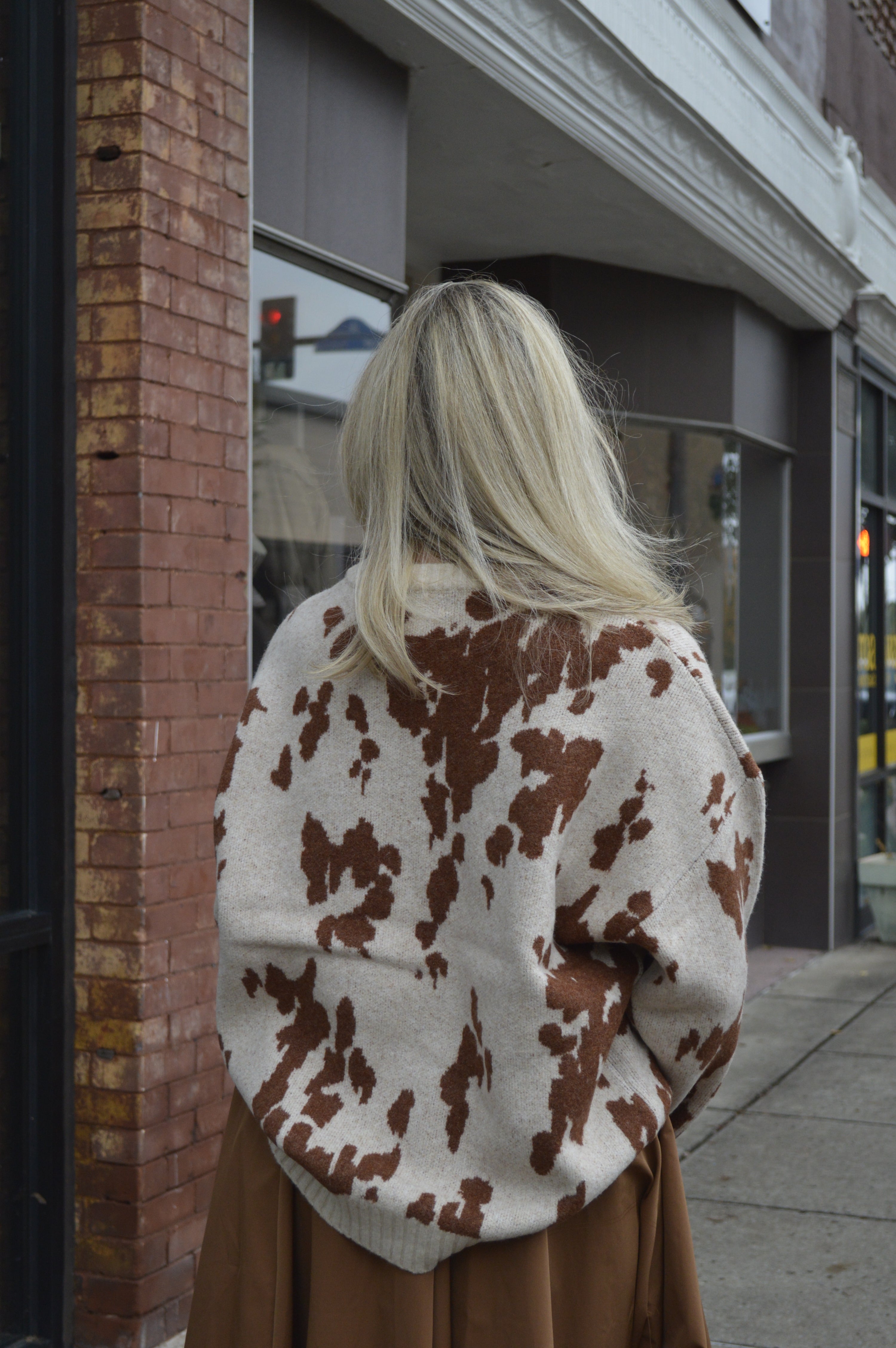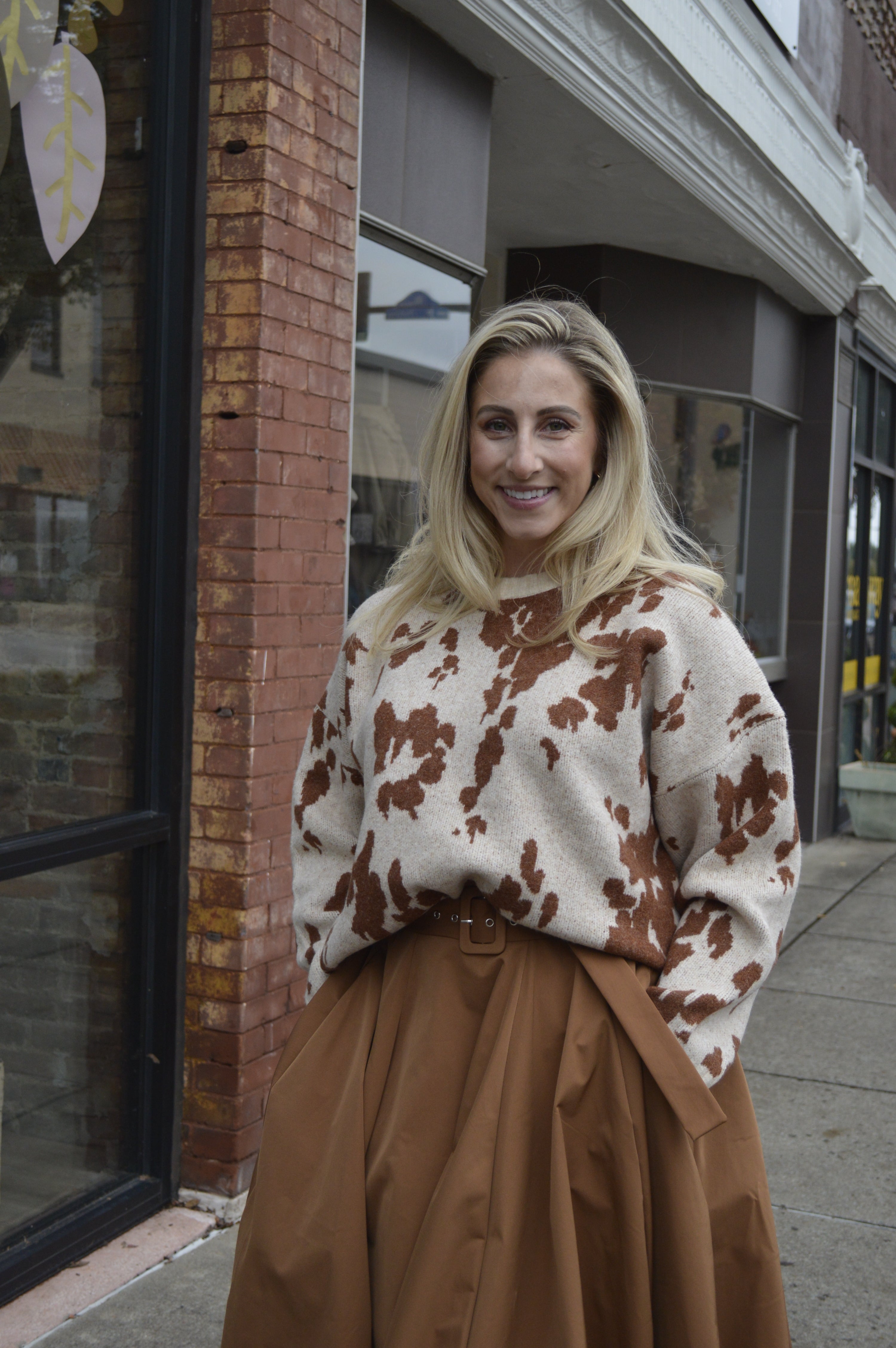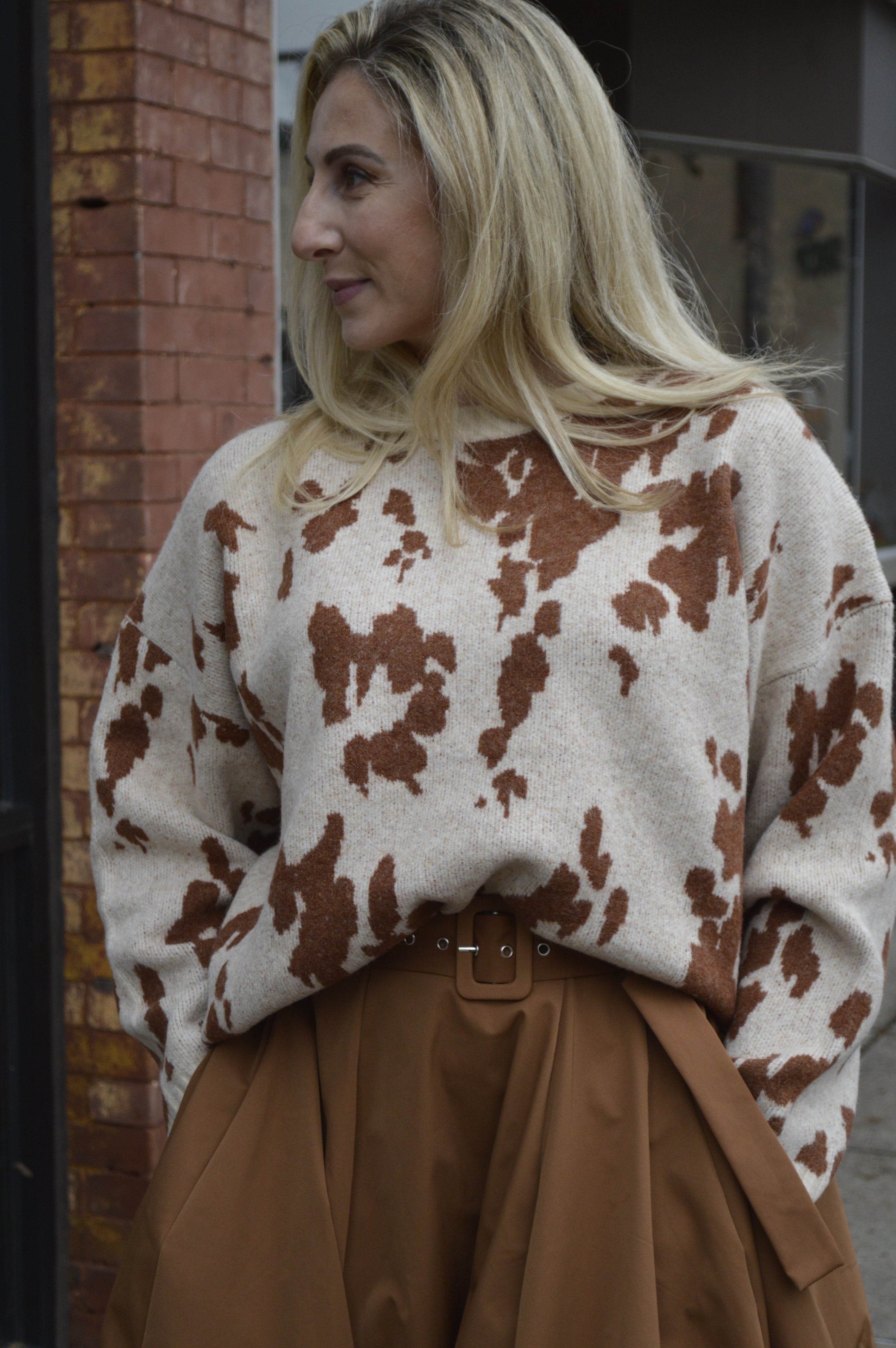 The Grace Sweater combines a cozy knit blend of acrylic, polyester, nylon, wool, and spandex with a fun animal pattern detail. Featuring a round neck and long sleeves, this pullover top adds a playful touch to your everyday look while keeping you comfortably warm.