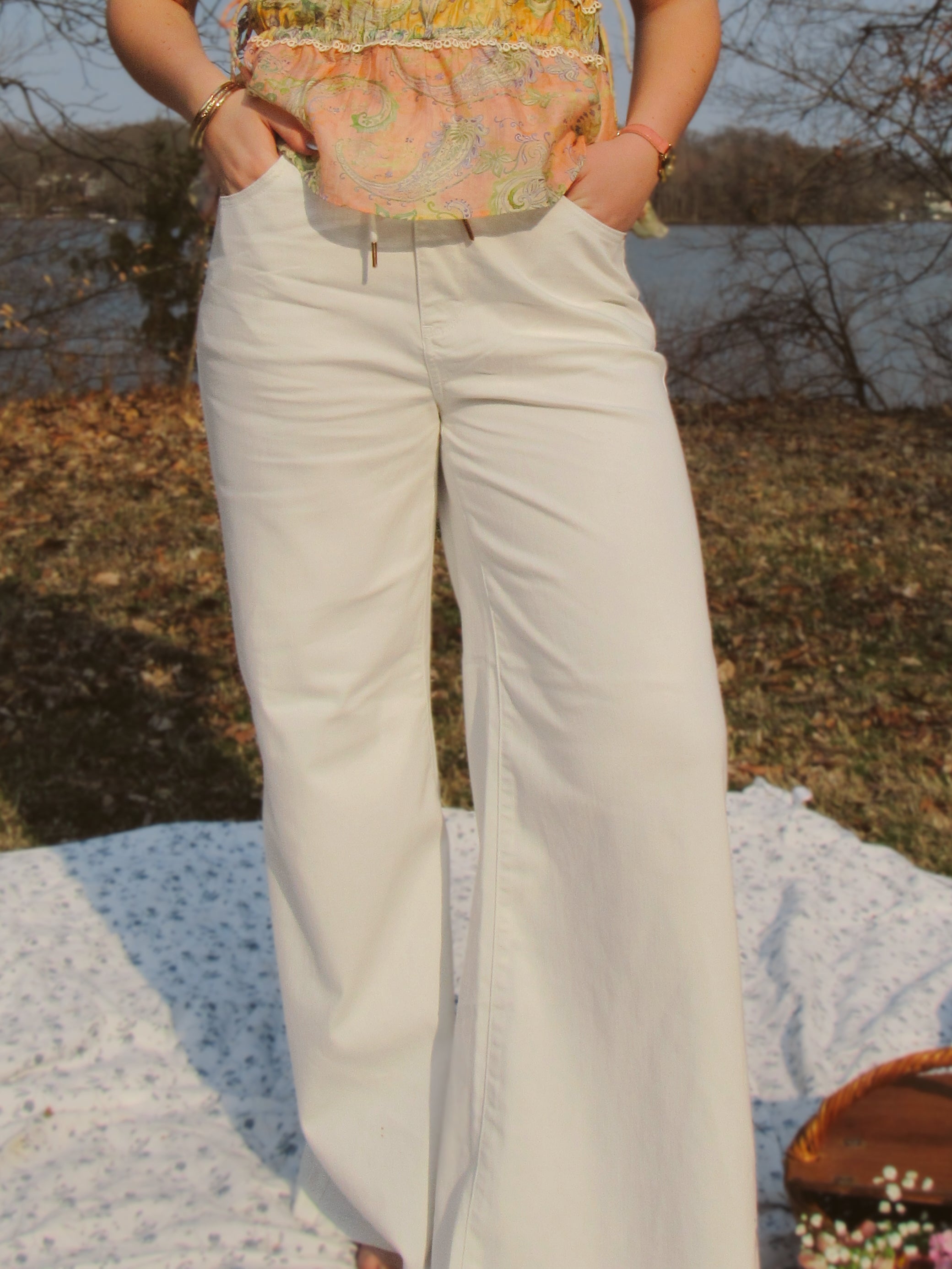Discover comfort and style with our White Featherweight Jeans. The high-waisted, palazzo design offers a flattering silhouette while the featherweight fabric keeps you cool. With an elastic waistband and chic rose gold trim, these jeans are perfect for effortless everyday wear. Enjoy looking great without sacrificing comfort!